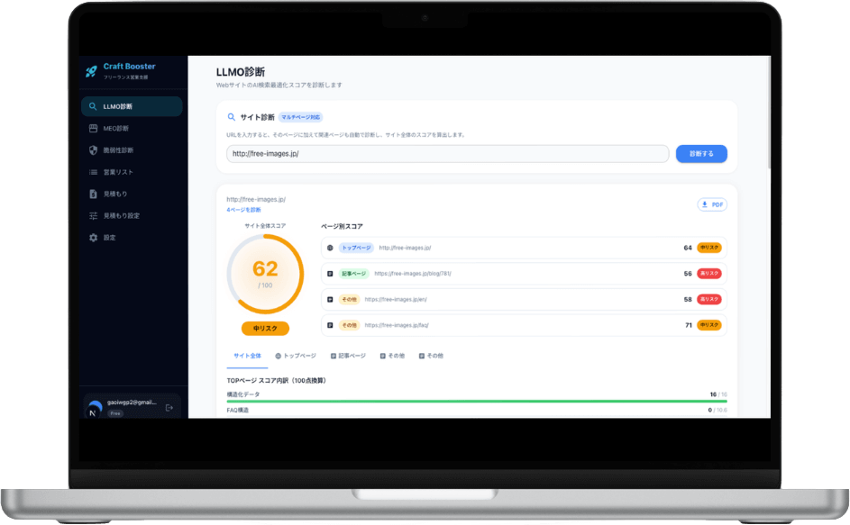 Craft Boosterなら、クライアントのURLを入力するだけで診断レポート・提案文がセットで生成されます。Web制作フリーランスの営業支援に特化した設計で、1件あたりの営業準備時間を大幅に短縮します。