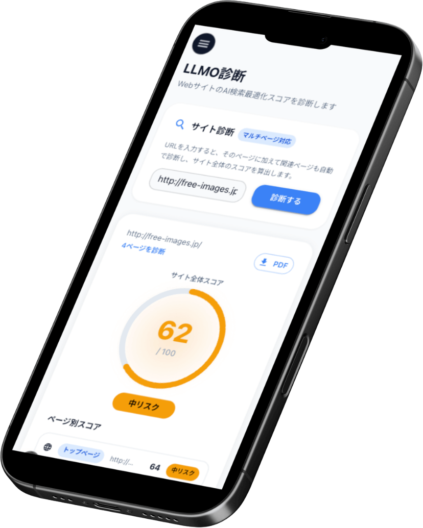 LLMO対策の状況、MEOの評価、セキュリティの脆弱性をスコア化。改善ポイントをAIが提案文として生成し、そのままPDFでクライアントに提出できます。